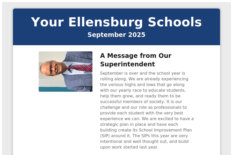 Your Ellensburg Schools September 2025 A Message from Our Superintendent September is over and the school year is rolling along. We are already exper. . .