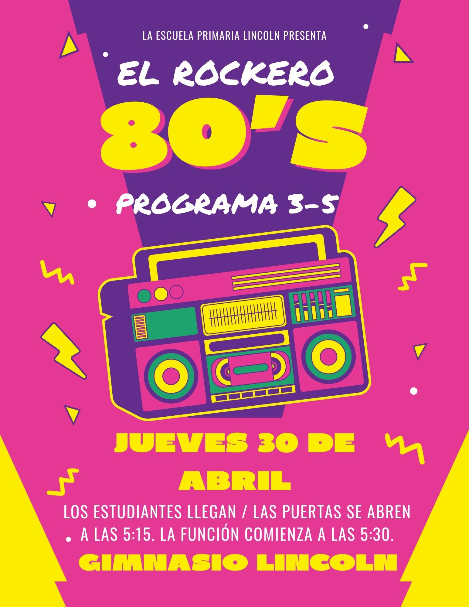 We are excited to invite you to our 3–5 Spring Program 2026 at Lincoln Elementary! The performance is scheduled for April 30th at 5:30 PM, with students arriving at 5:15 PM to prepare.
